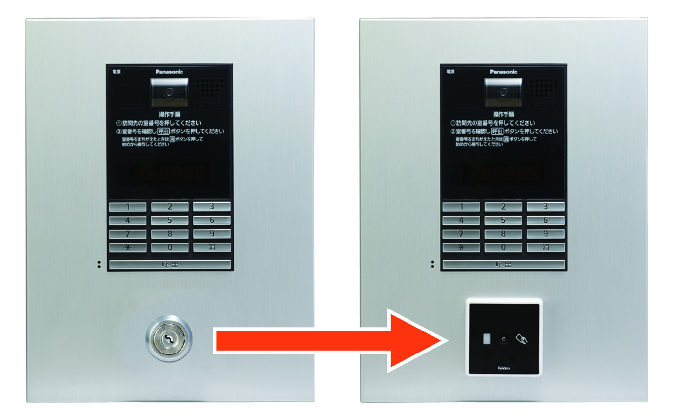 集合玄関機のキースイッチ部分を取り替えるだけで簡単に設置できる既存物件に最適な「キースイッチ取替型」と集合玄関機と一体になるフラットなデザインの「合玄関機組込型」の2種類からお選び頂けます。
